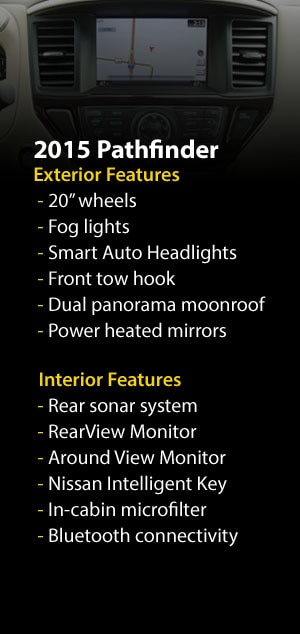 The 2015 Nissan Pathfinder is a versatile, fuel-efficient SUV with comfort for seven passengers and much, much more. New for the 2015 model year are standard and available features, including blind spot warning, rear cross traffic alert, and six new exterior colors. Below we've put together some information and specifications on this incredible SUV. When you're done reading, give us a call or head by our dealership and take the 2015 Nissan Pathfinder for a test drive!