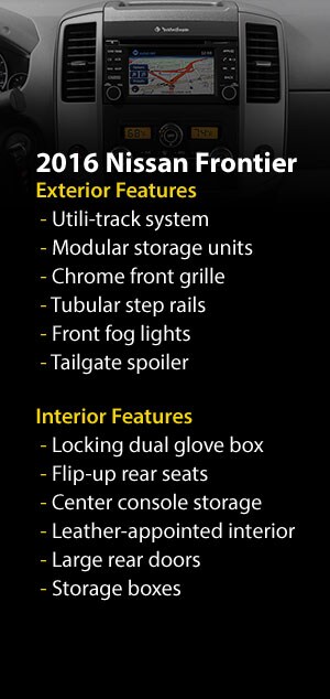 On the outside, the 2016 Nissan Frontier has tons of features that make it the perfect work truck. You'll love the high-utility bed that features factory-applied spray-on bedliner and the first-in-class Utili-track Channel System. This system utilizes five rails mounted in the bed that allow you to secure cargo via removable utility cleats. On the inside is a rugged yet comfortable interior with large rear doors, flip-up rear seats with removable storage boxes, and comfortable seats.Â