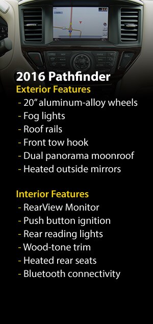 The 2016 Nissan Pathfinder is a fun and versatile SUV with a ton of passenger volume and great fuel economy. New enhancements for 2016 include a revised Almond-colored interior with contrasting black and beige materials, and a new Cold package for the SV trim that adds heated cloth front seats, a heated steering wheel, and heated outside rearview mirrors. Below we've put together some information and specifications on this fantastic SUV. When you're done reading, give us a call or head by our dealership and take the 2016 Nissan Pathfinder for a test drive.Â