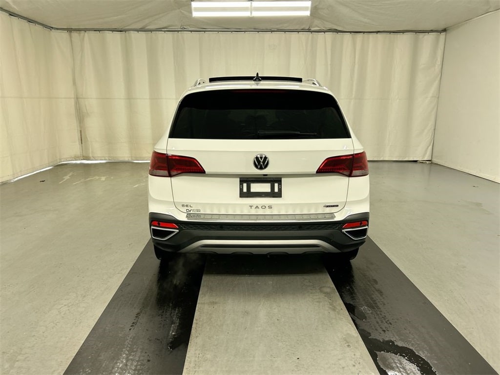 Pure White 2023 Volkswagen Taos 1.5T SEL AWD 7-Speed DSG Automatic with Tiptronic 1.5L I4 Turbocharged DOHC 16V LEV3-SULEV30 158hp **One owner vehicle**, Heated front seats, Navigation system: VW Car-Net Guide & Inform, Power moonroof.
